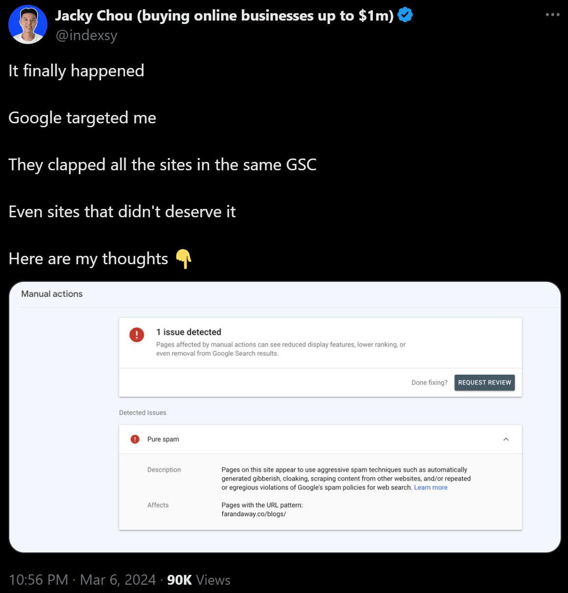 Following recent mass deindexing of AI sites by Google, I’ve become concerned about a specific issue: All Jackie Chou’s sites on a single Google Search Console account were hit with manual penalties.